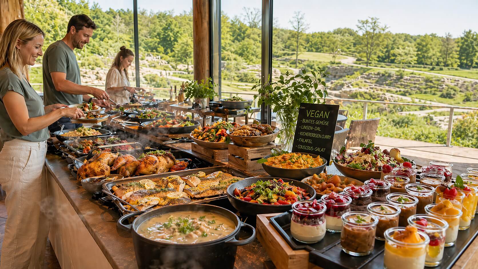 Zum Mittag hin erweitert unser Küchenteam das Büfett um warme Speisen. Freuen Sie sich auf Suppe, Geflügel- und Fischgerichte, leckeres Gemüse und hausgefertigte Beilagen. Auch für vegane Gäste ist gesorgt: Mit kreativen Gerichten aus Gemüse und weiteren pflanzlichen Zutaten zeigt unser Küchenteam, wie abwechslungsreich Genuss sein kann. Den süßen Abschluss bilden liebevoll handgefertigte Desserts in kleinen Mini-Gläsern. Kaffee und Tee sind im Preis bereits enthalten.